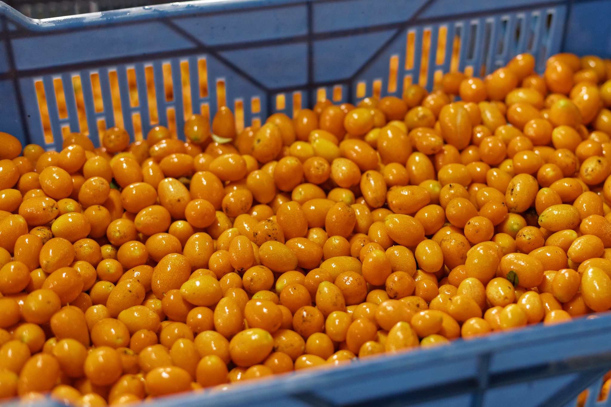 Consumido como a uva, o kumquat é uma fruta cítrica exótica produzida no Chile, de formato oval, cor amarelo alaranjado e tem um sabor único agridoce.